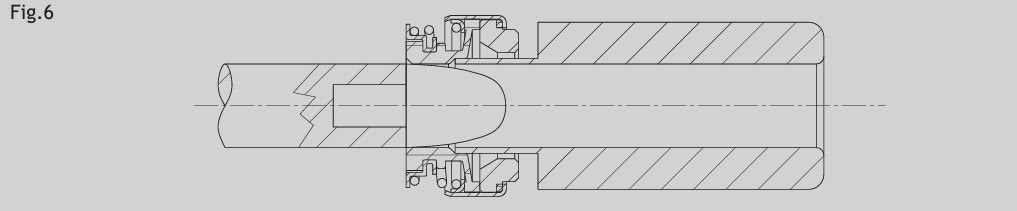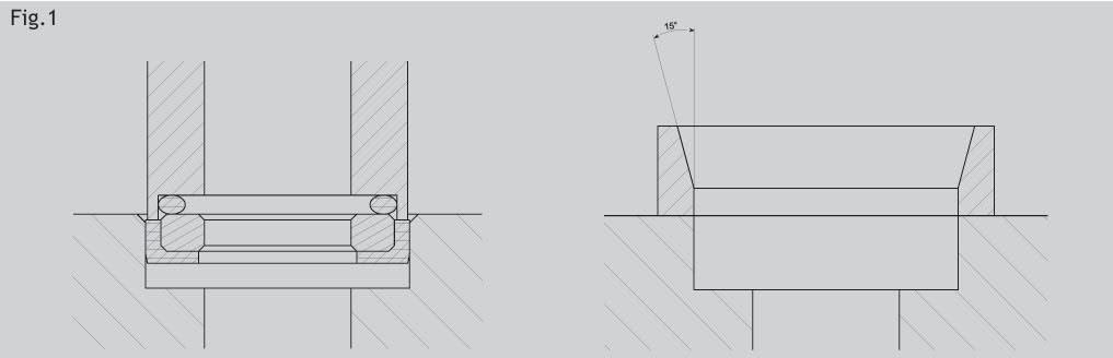 Şekil 1'de gösterilene benzer bir montaj aleti kullanarak karşı yüzü yuvasına eşit bir şekilde itin. Bu alet, yerleştirme kuvvetini homojen bir şekilde dağıtarak deformasyon veya hasar oluşmasını önler. Giriş yivleri, bileşeni doğal olarak doğru konuma yönlendirir. Yuvaya giriş yivleri açılması mümkün değilse, Şekil 2'de gösterildiği gibi konik bir kılavuz manşon kullanılması zorunludur. Bu aksesuar, elastomer manşonun girişini kolaylaştıran kademeli bir rampa oluşturur ve yerleştirme sırasında olası hasarlardan korur.